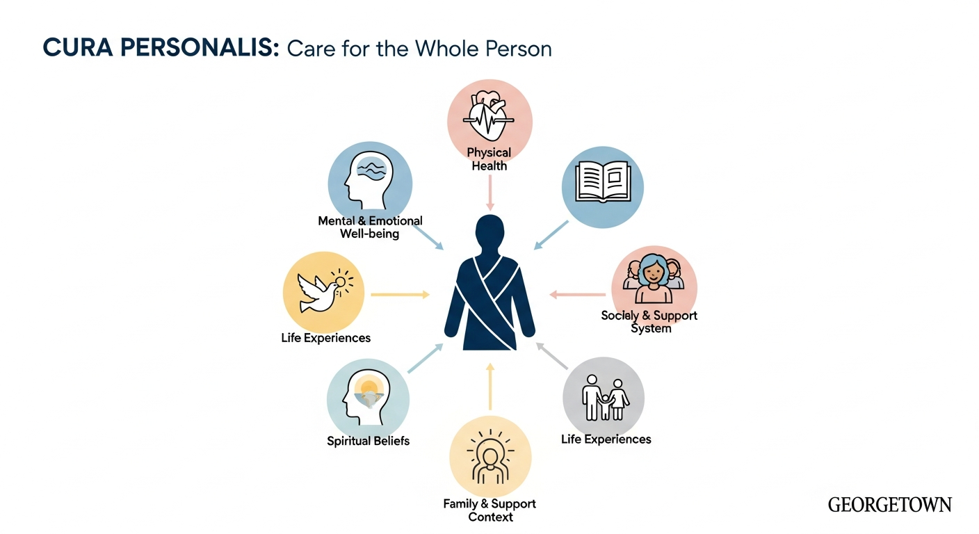 Georgetown’s principle of ‘cura personalis’ calls for physicians to care for the whole person, considering the interconnected physical, mental, social, and spiritual aspects of a patient’s well-being.